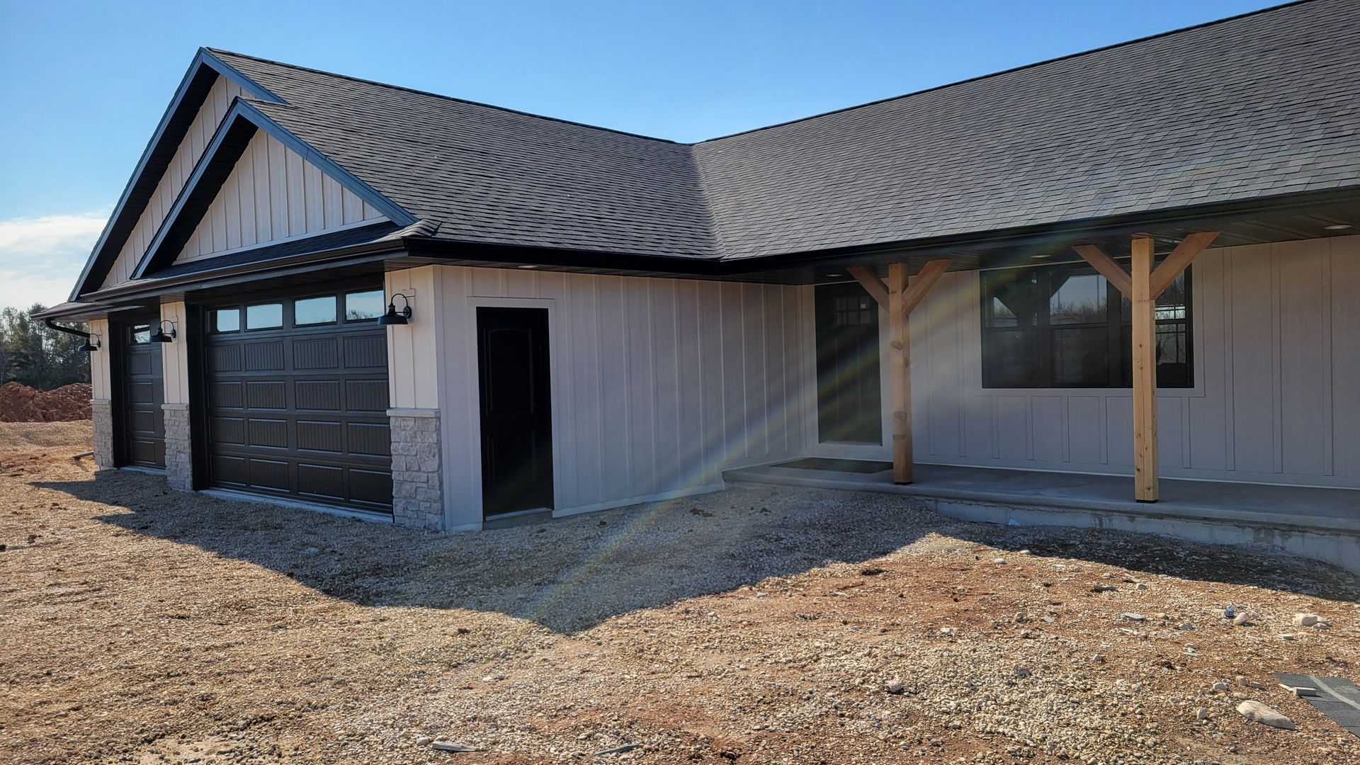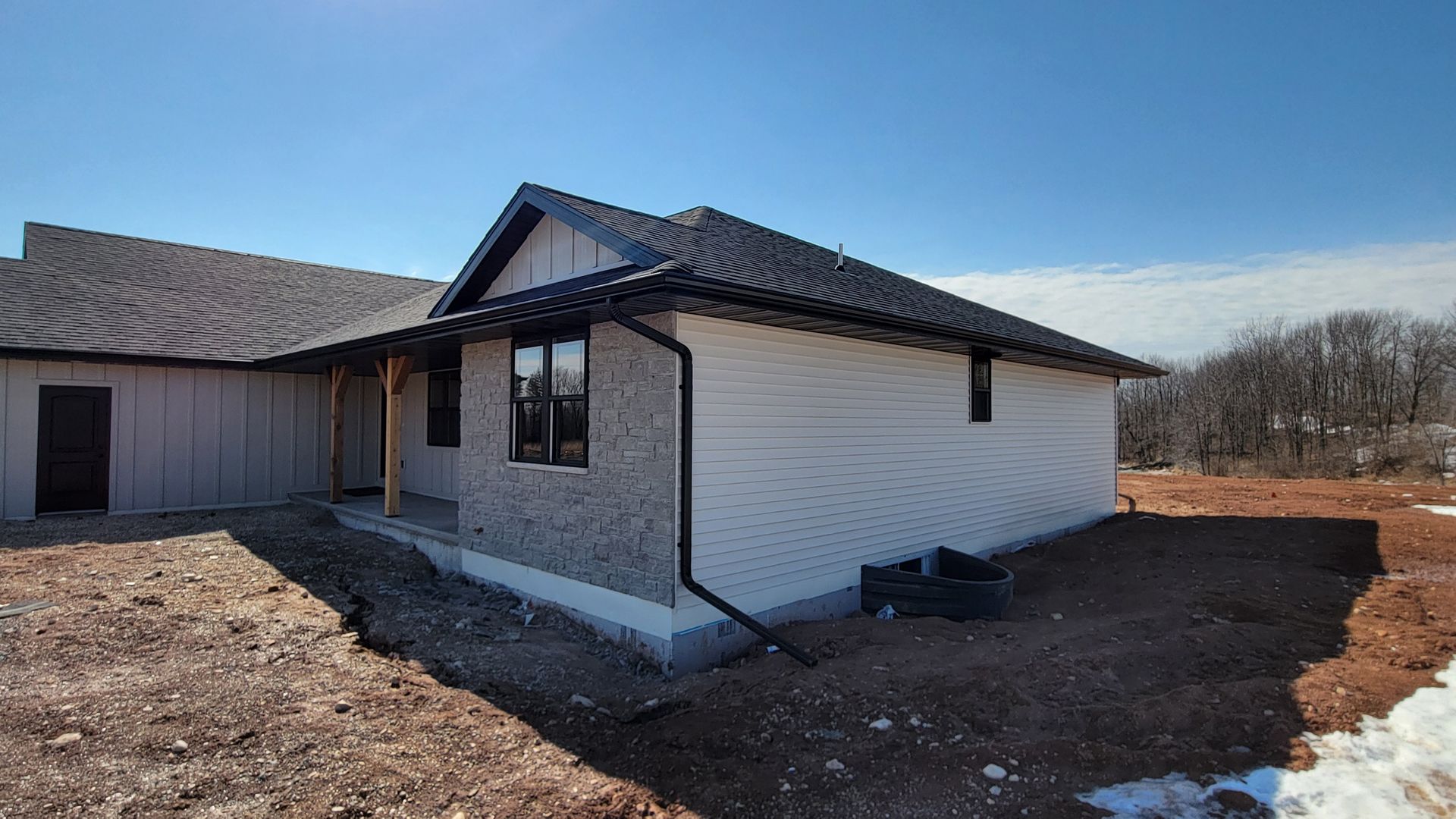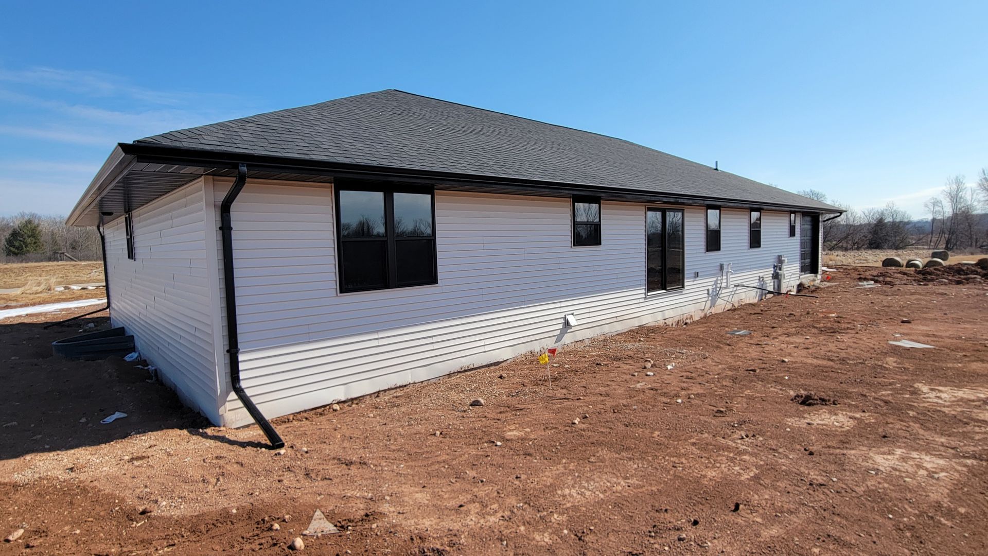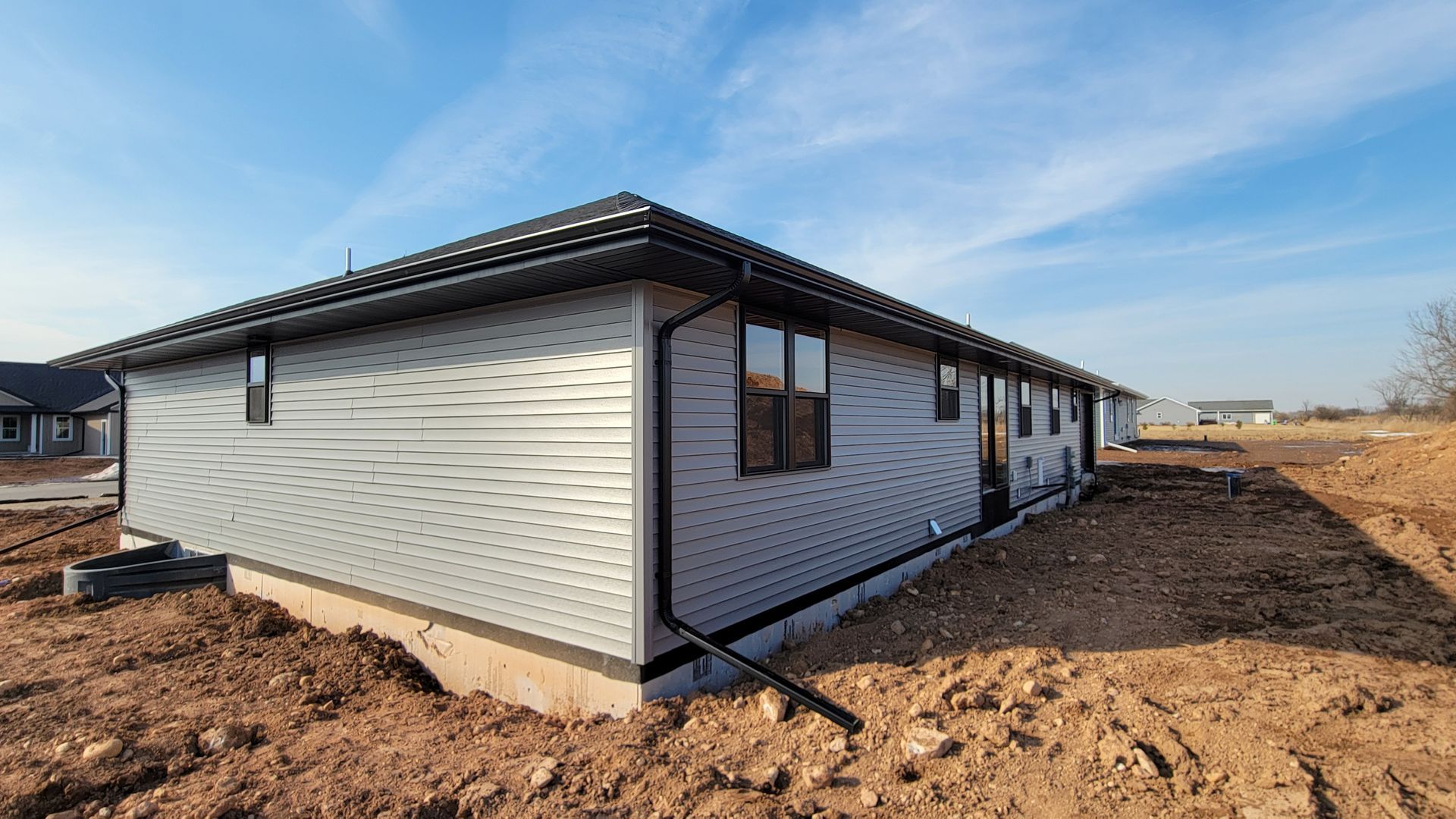 Two new construction homes with Black 5 inch gutters and 2x3 downspouts