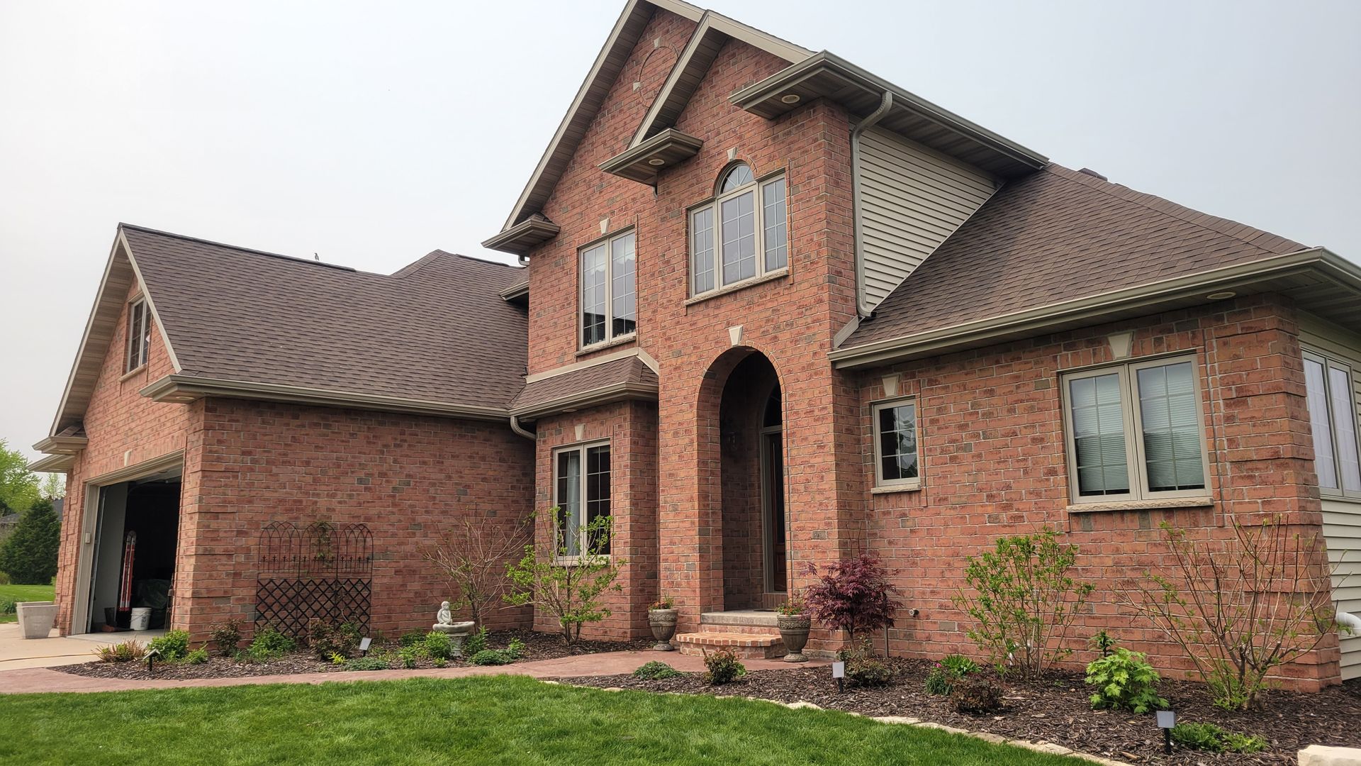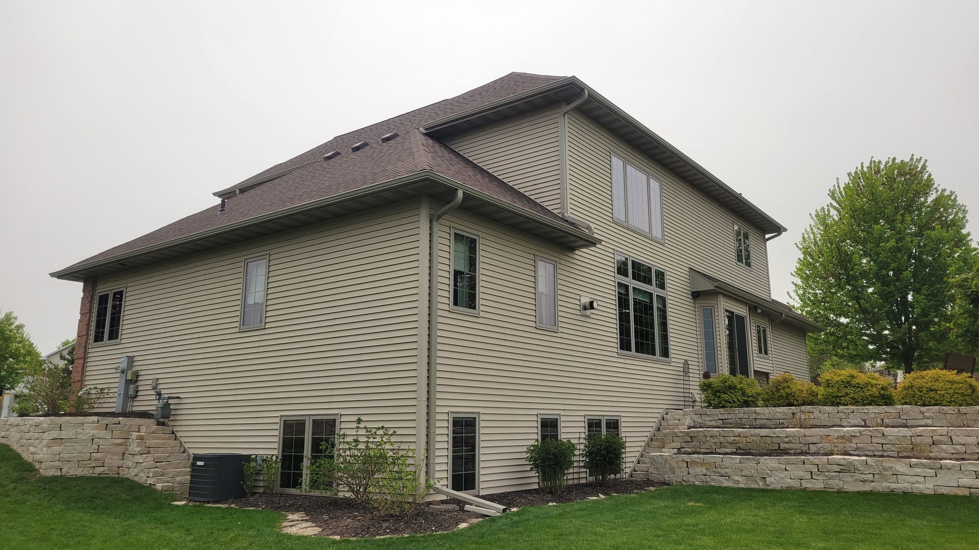 Two new construction homes with Black 5 inch gutters and 2x3 downspouts