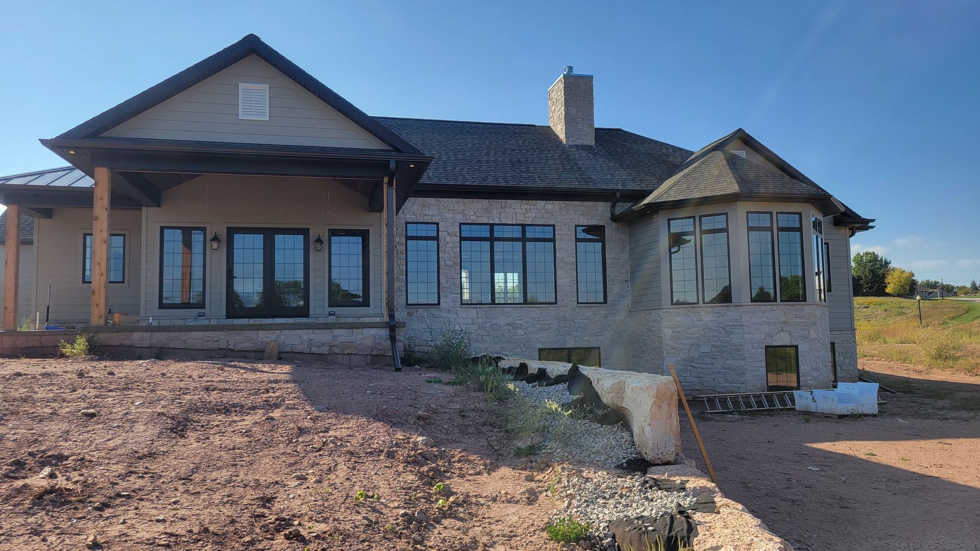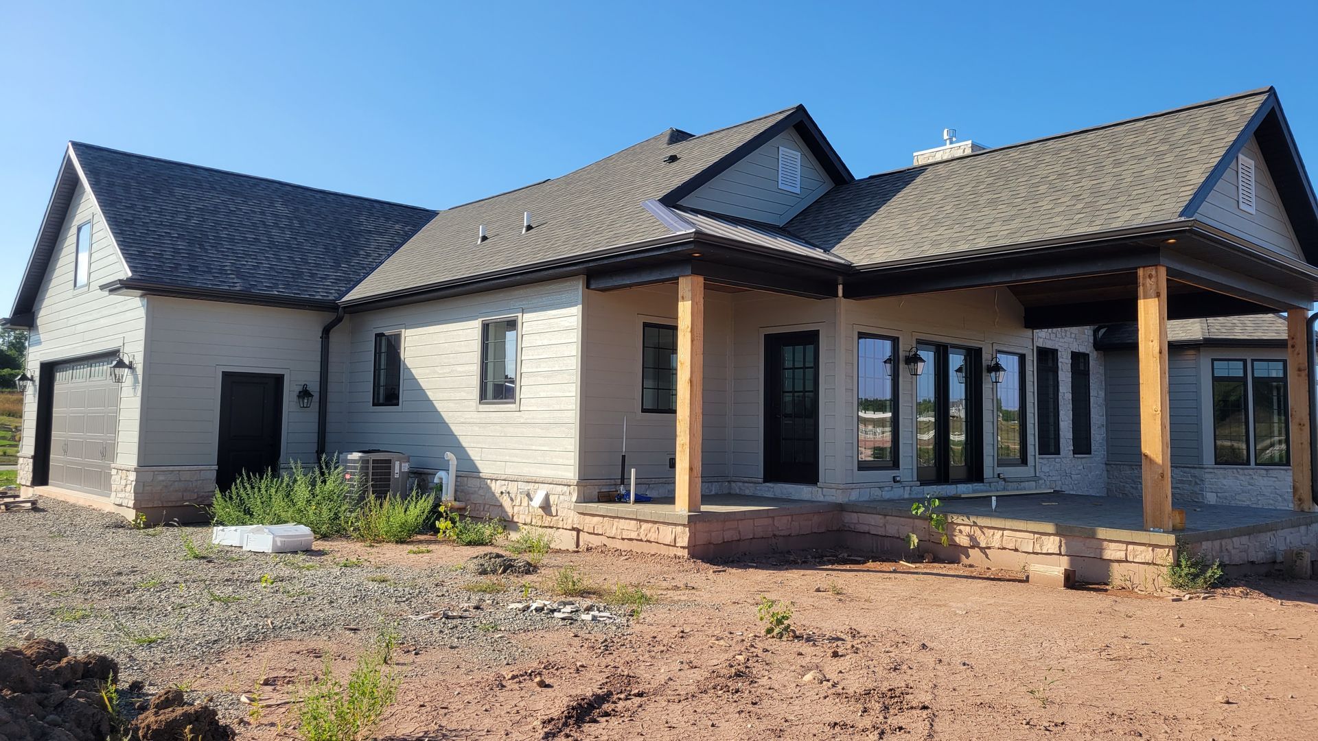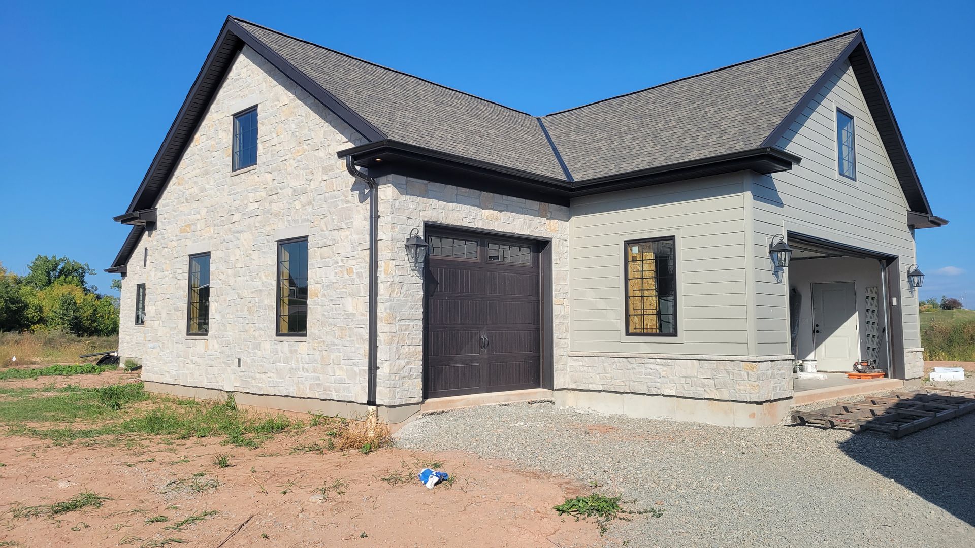 Two new construction homes with Black 5 inch gutters and 2x3 downspouts