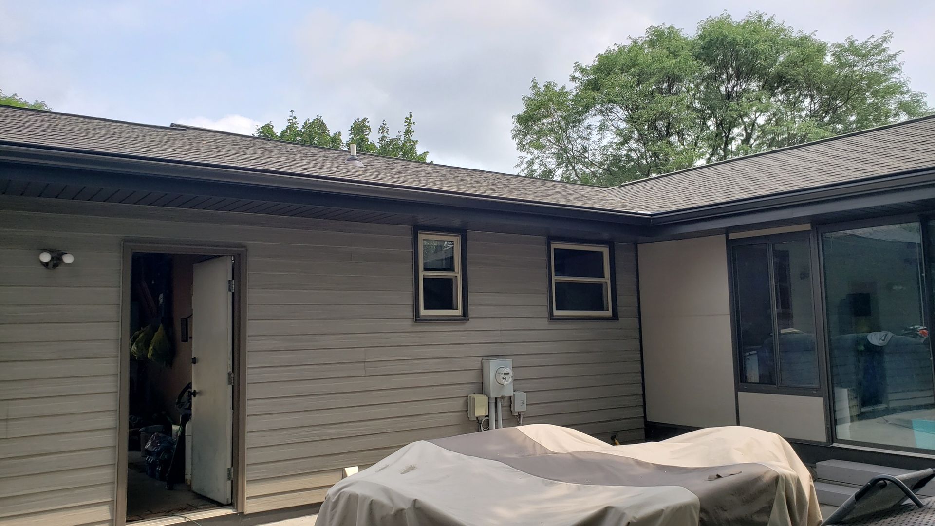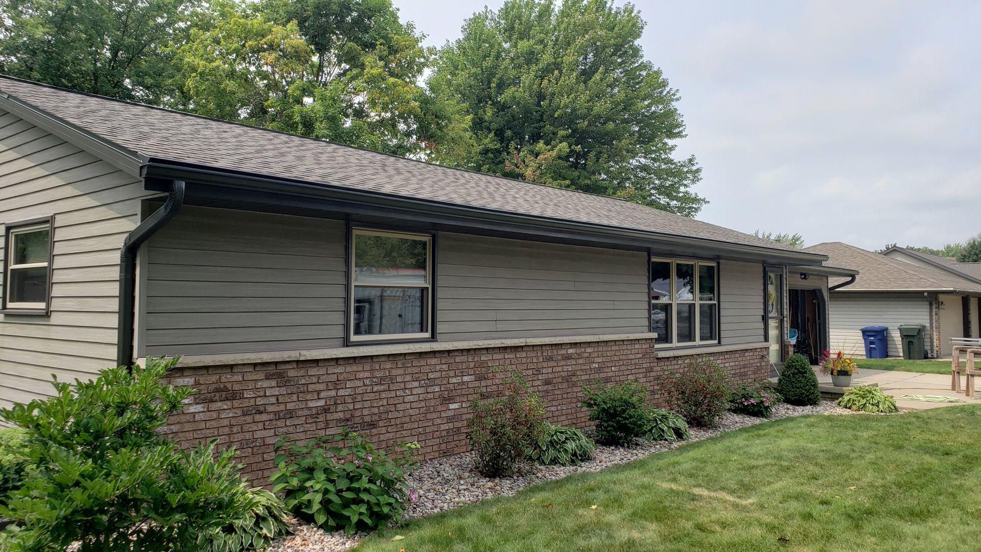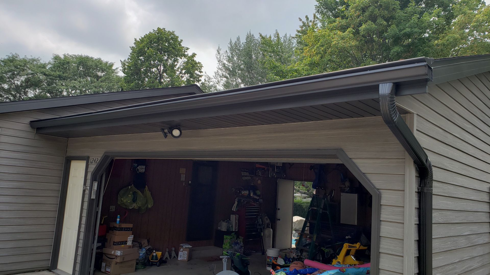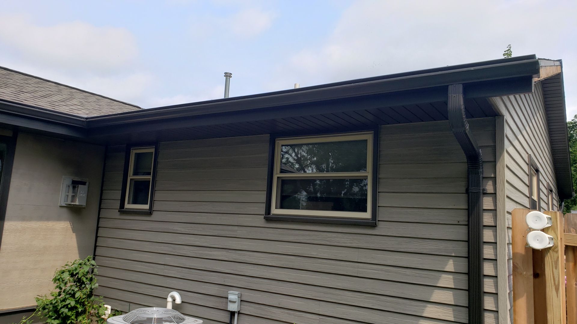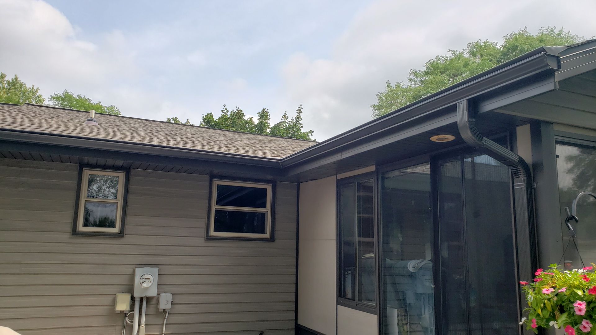 Dark Bronze 5 inch gutters, 3x4 downspouts and Leaf-X