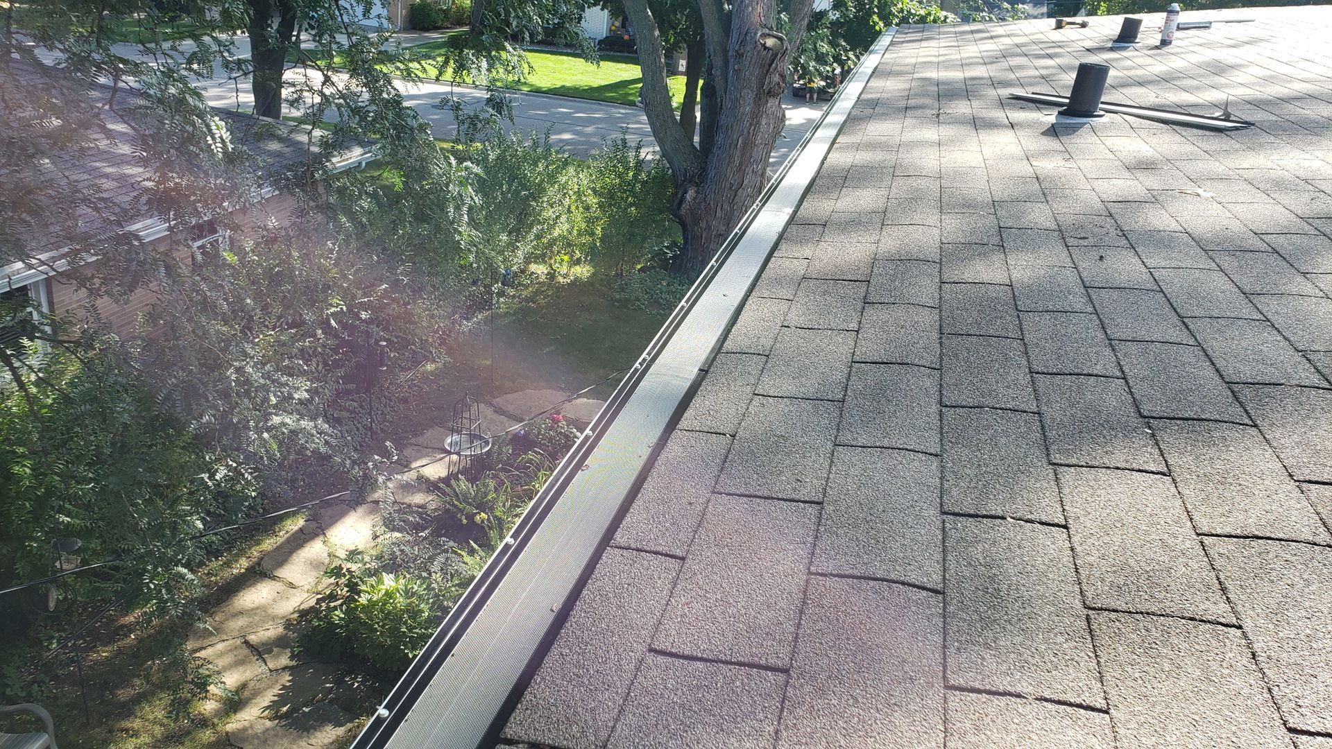 White 5 inch gutter and 3x4 downspout with One Gutter Guard under shingle