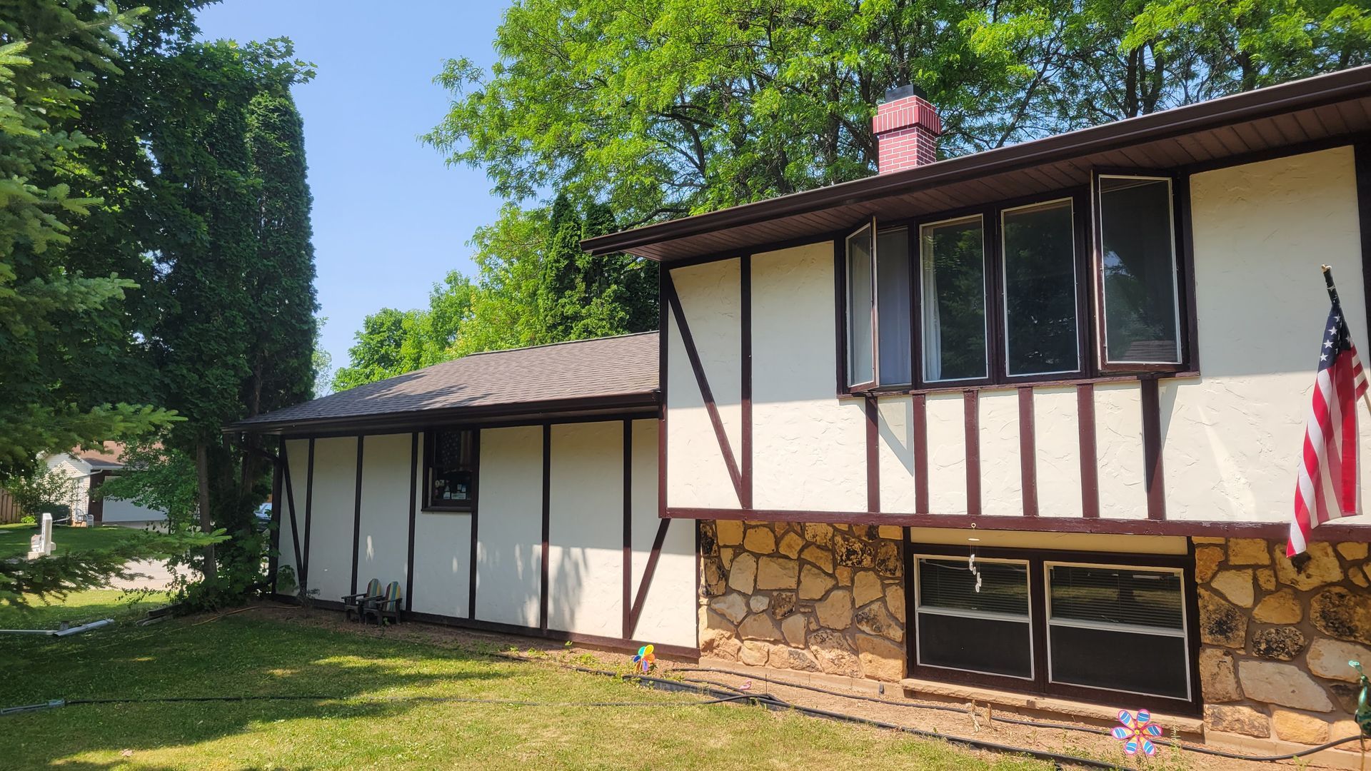 A very vulnerable area often missed is where the gutter meets a wall, either against the siding or J-Channel. A deflector to direct the water from those areas into the gutter is the best way to prevent water dripping and future deterioration.