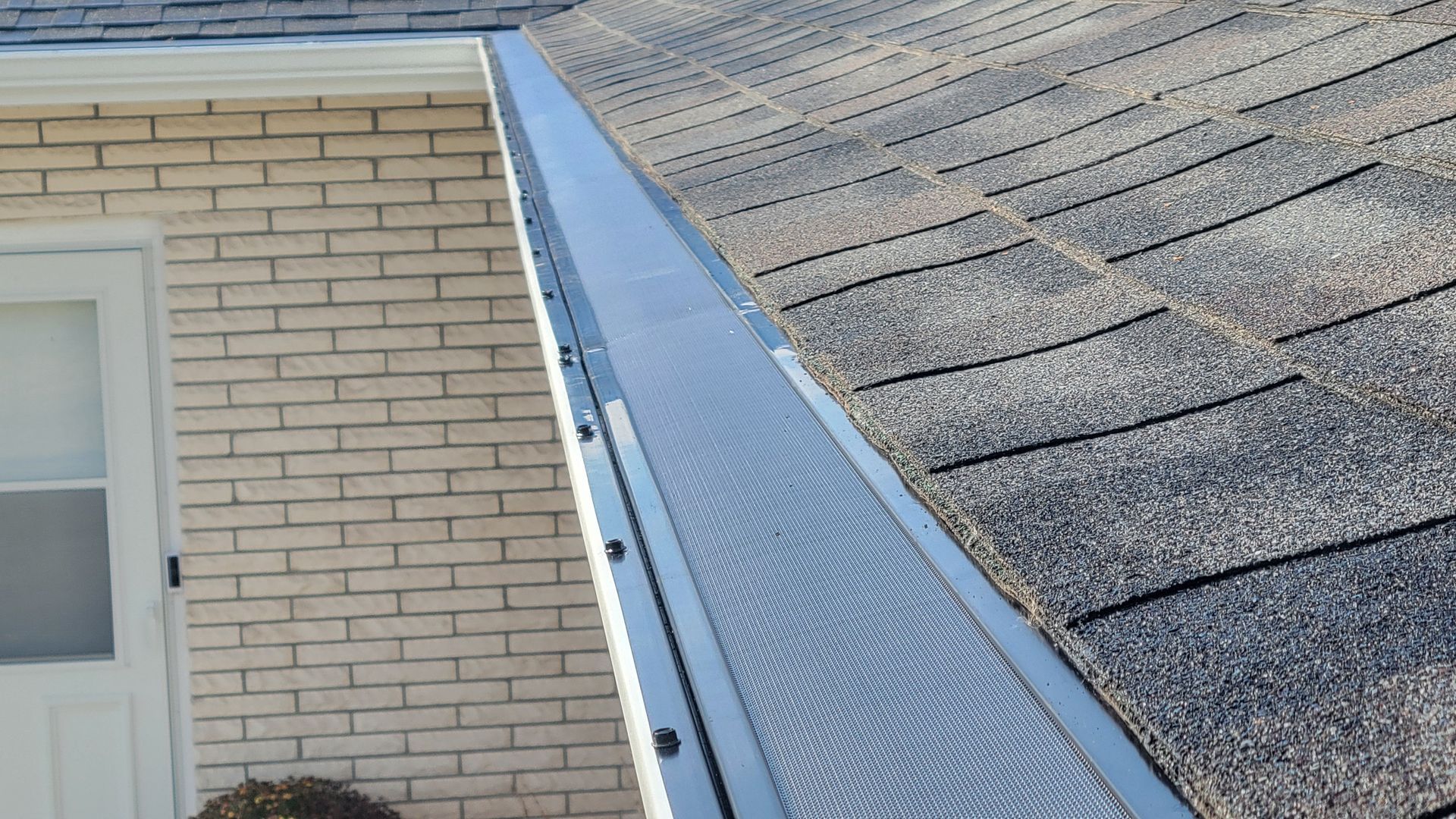 White 5 inch gutter and 3x4 downspout with One Gutter Guard under shingle