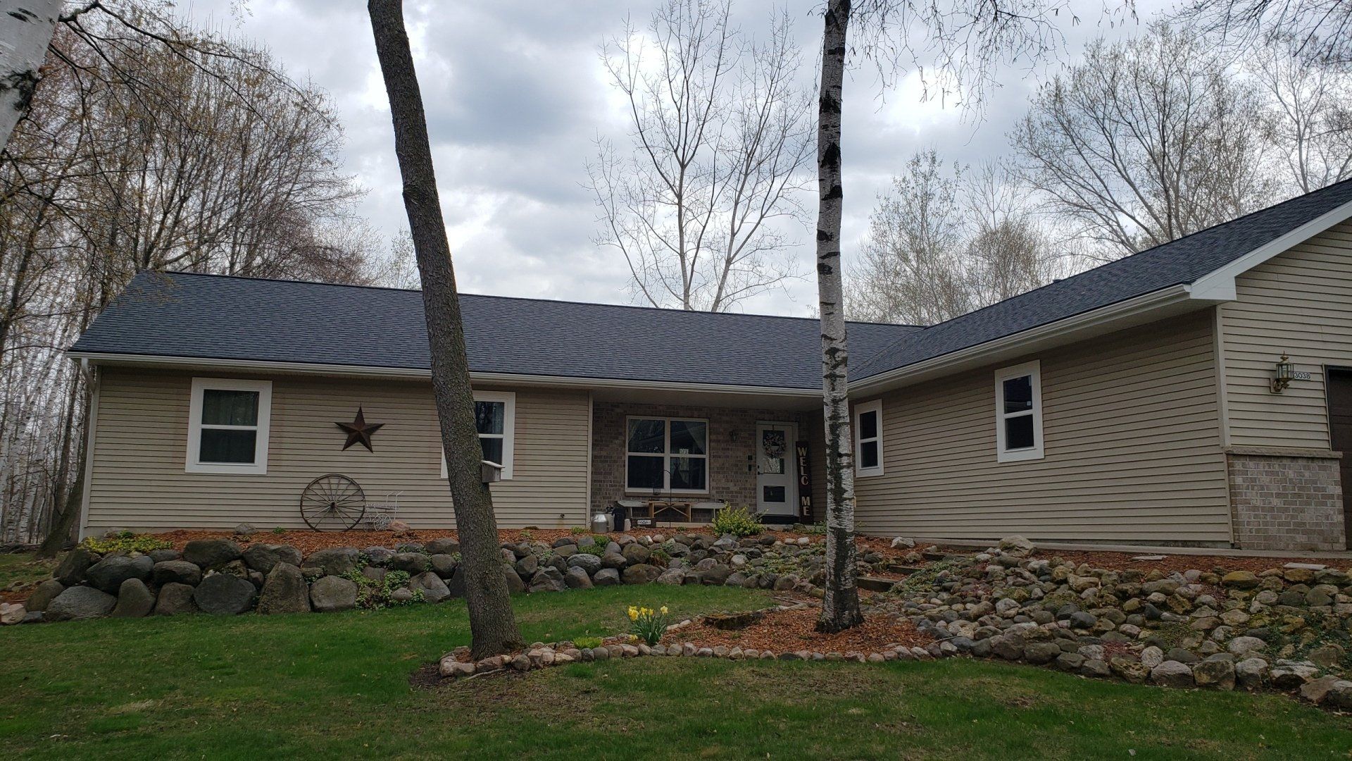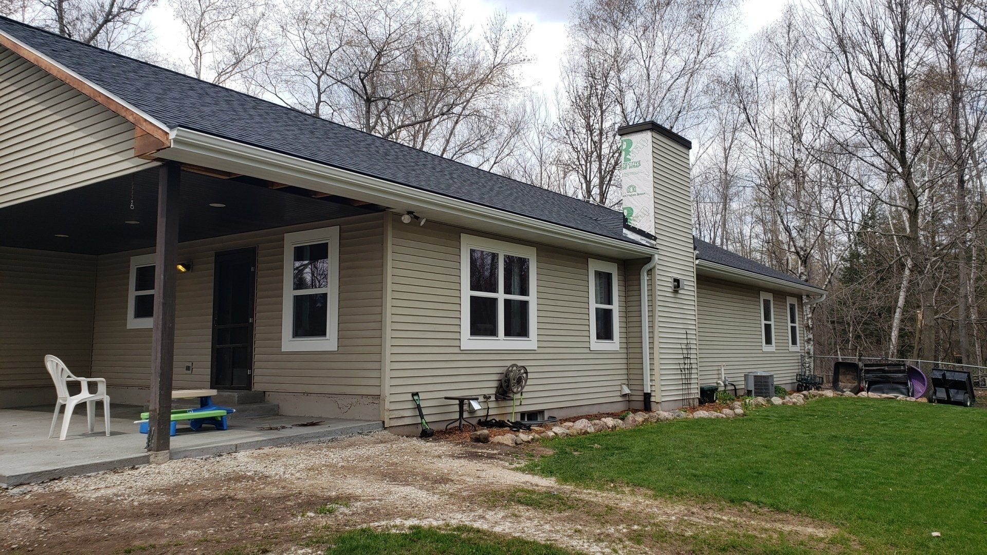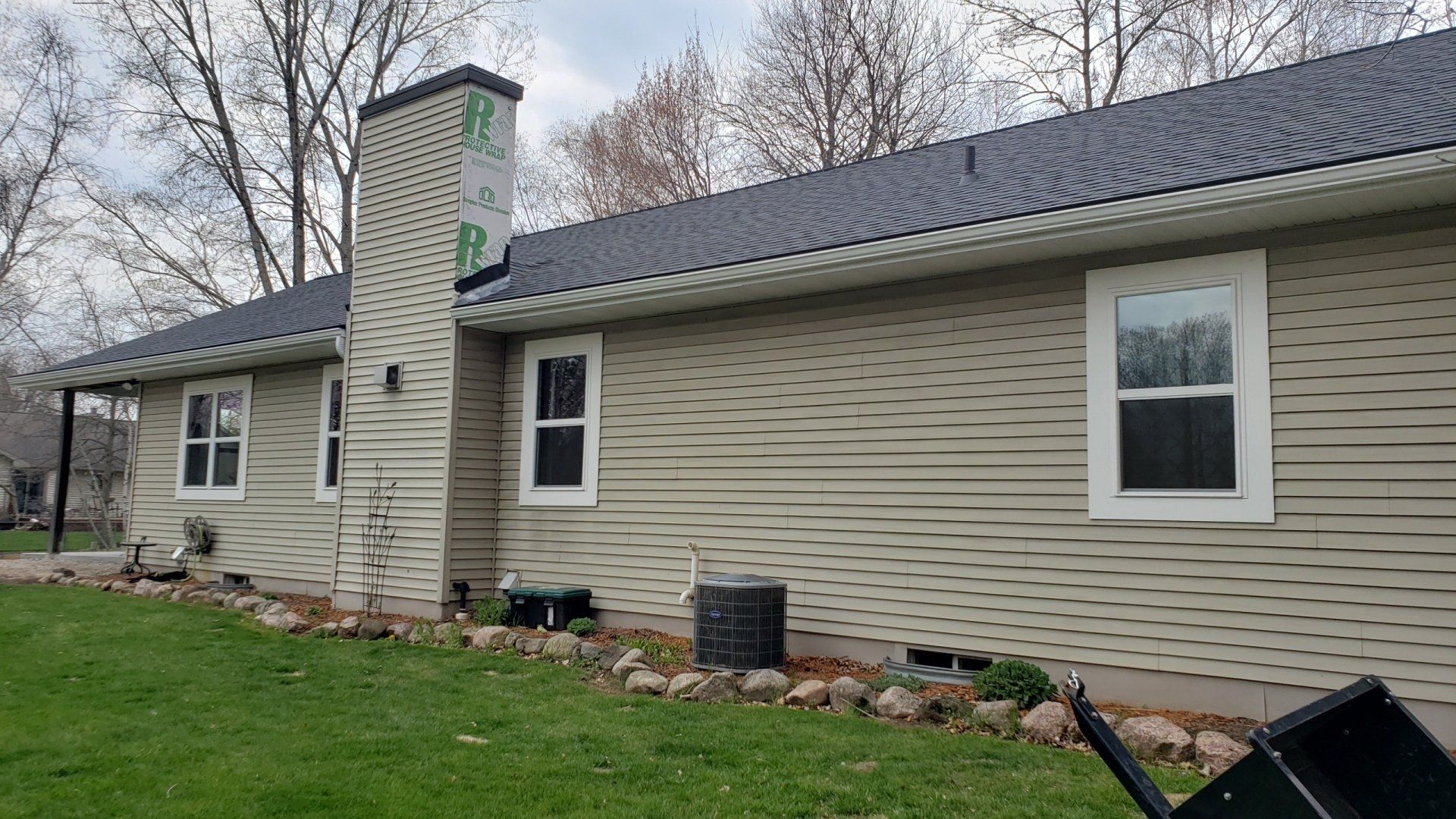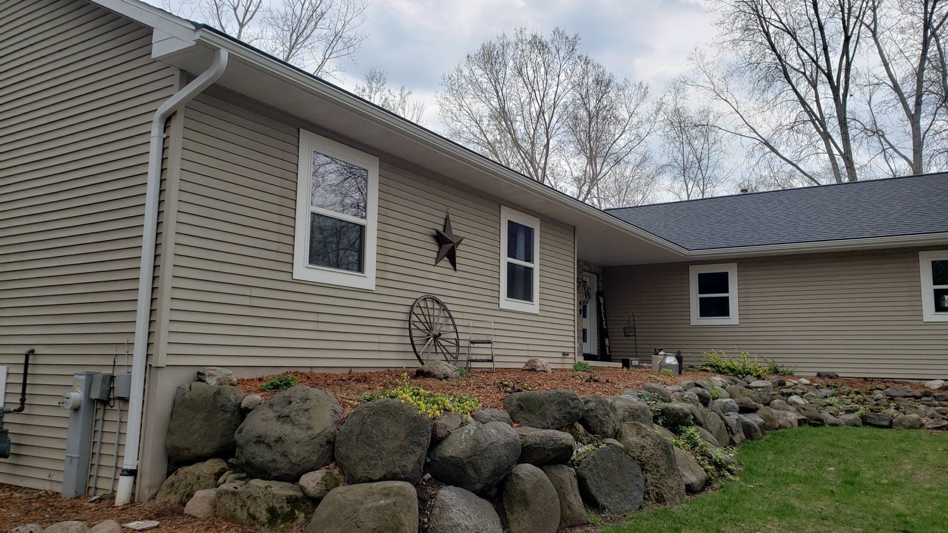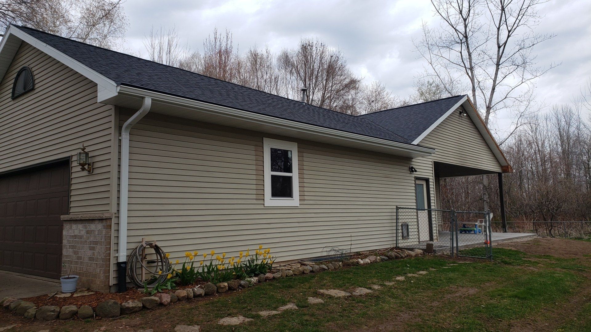 White 5 inch Gutters and 3x4 Downspouts with Black Leaf-X